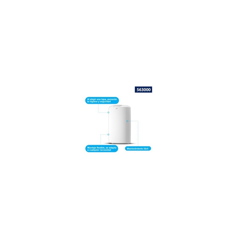 El contenedor de basura de 50 L de la línea Elevation color blanco es ideal para cualquier baño y puede montarse fácilmente en la pared o en el suelo para adaptarse a diferentes necesidades y espacio. Los contenedores de basura de la línea Tork Elevation tienen un diseño moderno y funcional. Presentación: 1 pieza. Clave: 563000. Marca: Tork.